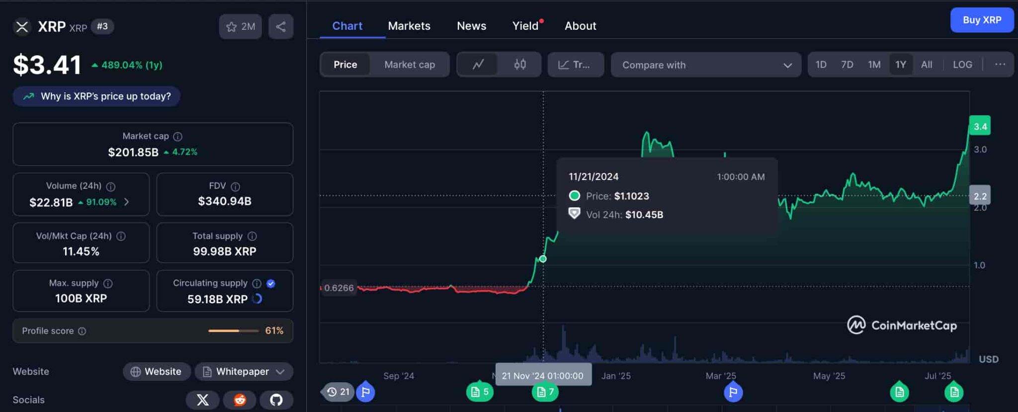 As of July 18, XRP is trading at $3.41, just under its all-time high of $3.84 set in January 2018. If the current momentum holds and ETF optimism spreads beyond Bitcoin and Ethereum, XRP may soon challenge its historical peak, making that $1,000 bet from January look even smarter in hindsight.