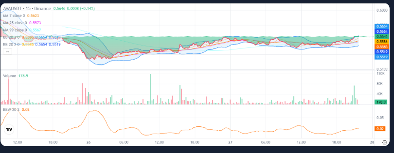 AVA has demonstrated gradual strength, moving from $0.552 to consolidate near $0.564 with a steady upward trajectory. Bollinger Bands are kept thin and Bollinger Bandwidth indicates lower volatility. The price is trading over the 7, 25 and 99-period moving averages, which denotes bullish alignment in different time frames.