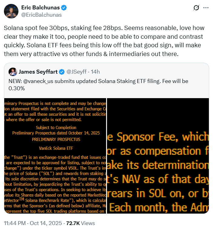 Analyst Eric Balchunas said the fee looks reasonable and makes Solana’s ETF attractive compared to others.