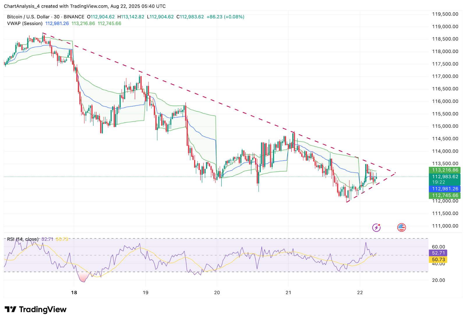 Intraday action on the 30-minute chart shows BTC consolidating under a descending trendline near $113,200. The RSI has recovered slightly to 52 after dipping below 40 earlier in the session, pointing to neutral momentum. VWAP aligns closely with price at $112,981, suggesting equilibrium.