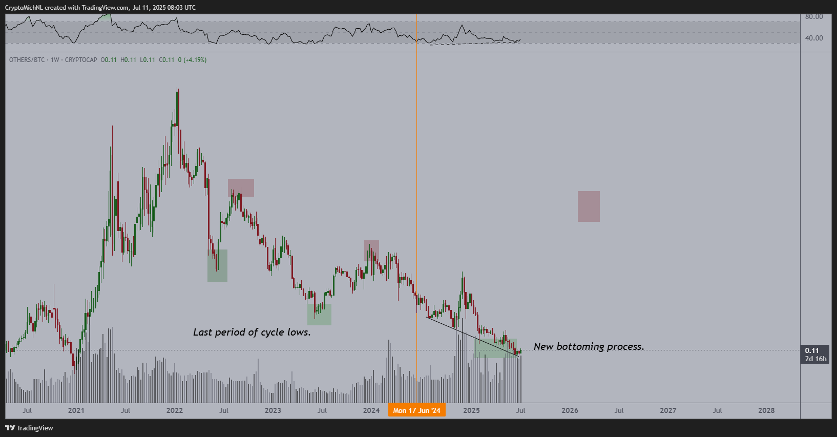 Lastly, Van de Poppe believes that the downtrend in the total market capitalization of altcoins versus Bitcoin is about to reverse. The widely followed analyst says altcoins are forming a bullish divergence against Bitcoin on the weekly time frame – an indication that altcoins are bottoming out against the flagship crypto asset.