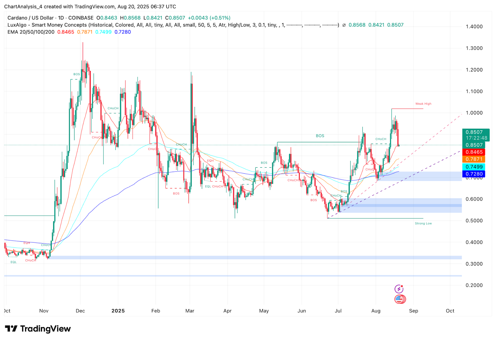 On the daily chart, Smart Money Concepts signals show both Break of Structure (BOS) and Change of Character (ChoCH), highlighting mixed conditions. ADA recently formed a weak high near $0.90, while support rests at the 20- and 50-EMA cluster around $0.846. A deeper drop could expose the liquidity pool near $0.749, but holding above $0.846 keeps the short-term structure constructive.