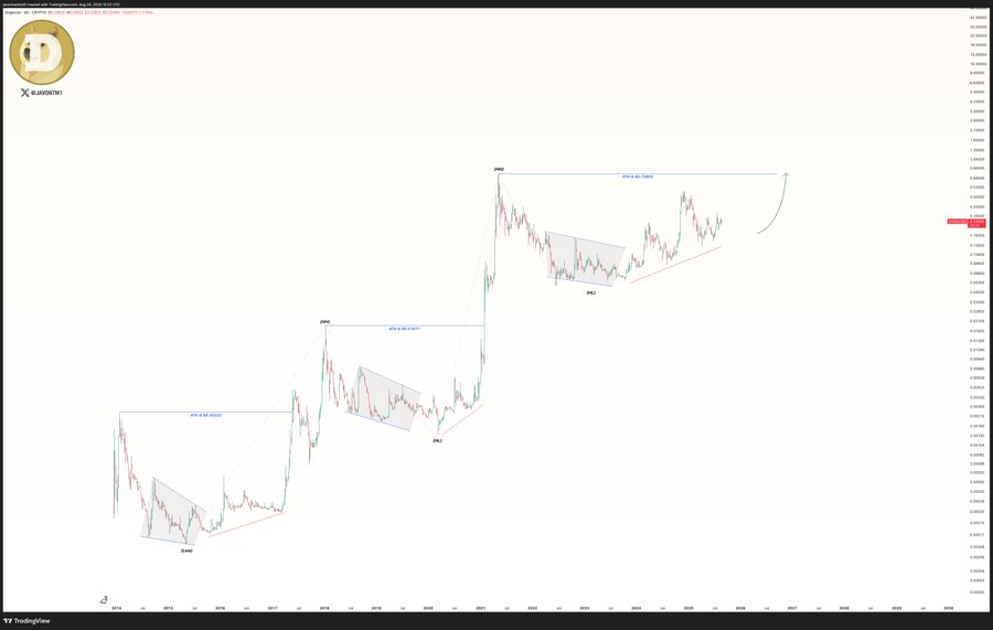 Marks noted that the current structure mirrors those past cycles, with Dogecoin respecting an ascending support trendline and forming another accumulation wedge. He described this as one of the token’s “most bullish phases,” projecting a move of more than 3x from current levels to push prices above the $0.73905 all-time high set in 2021.