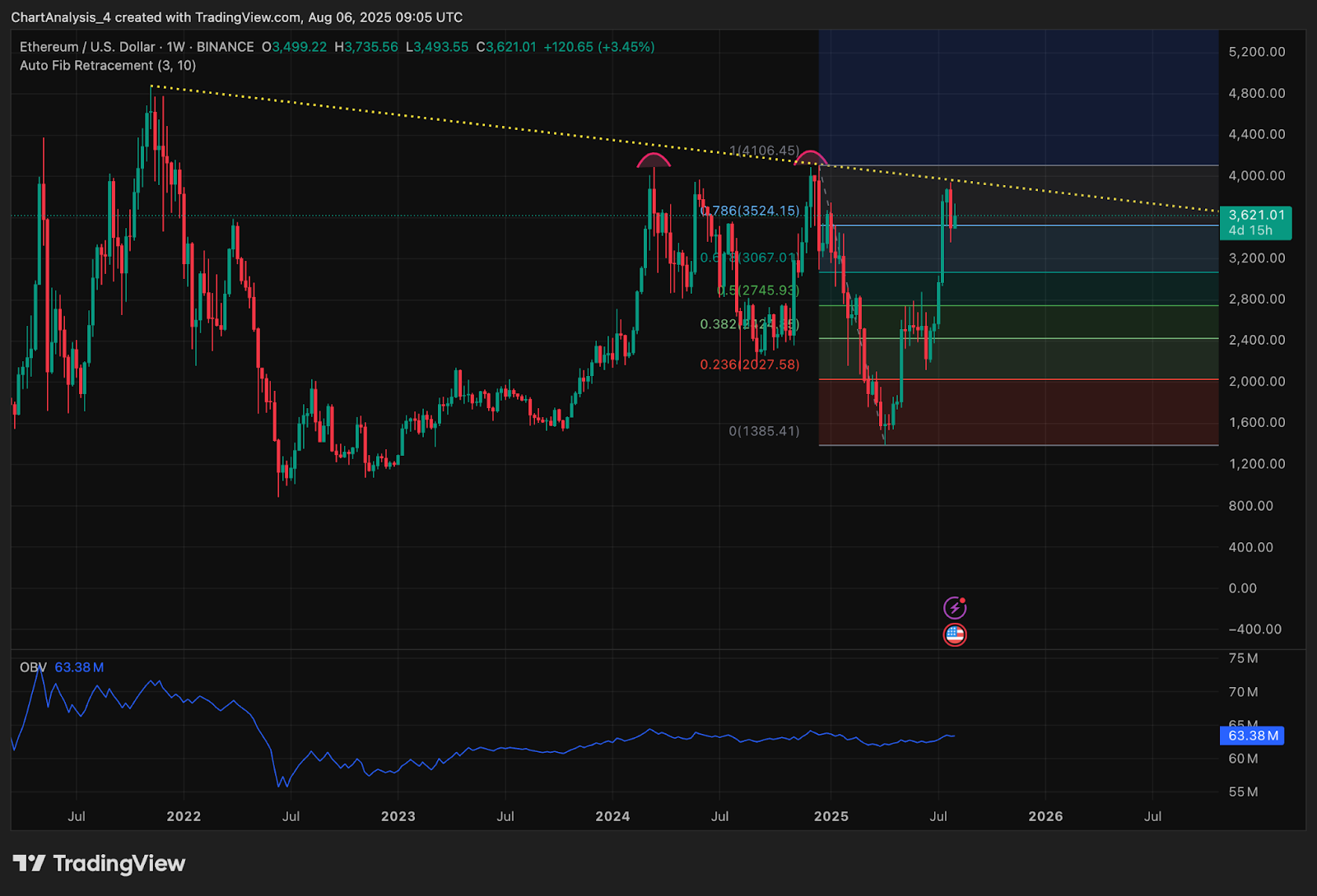 ETH is at a pivotal juncture. A breakout above $3,700 with strong volume could push Ethereum price toward $3,850 and retest $3,900, the high from late July. Clearing this level would open a move toward $4,100, which also aligns with the macro descending resistance from the 2021 peak.