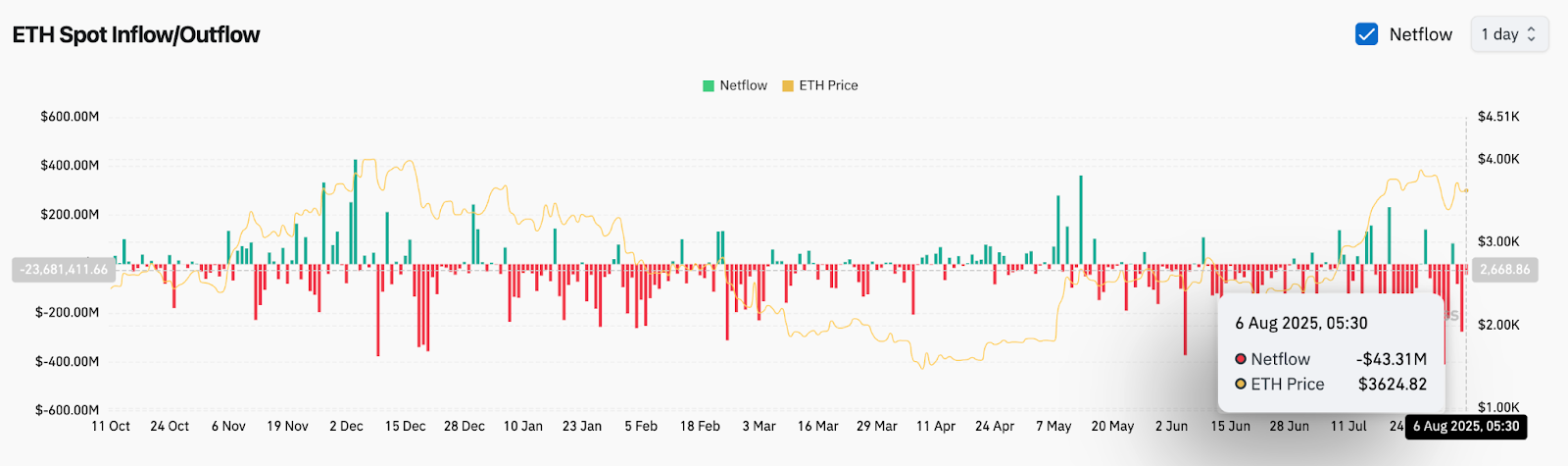Why Ethereum price going down today can be attributed to weakening inflows and hesitancy at overhead resistance. According to the latest on-chain spot flow data, August 6 saw a net outflow of $43.31 million, reflecting broader capital withdrawal from exchanges. This coincided with ETH stalling under the $3,650 intraday resistance.