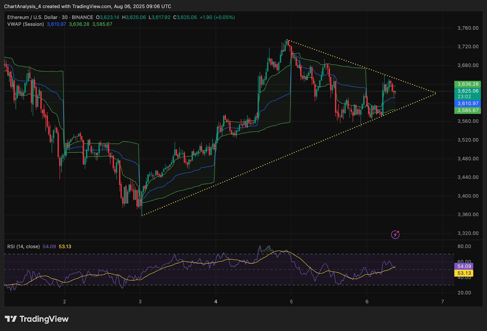 After a sharp rally toward $3,900 in July, Ethereum price has entered a consolidation phase that has formed a symmetrical triangle on the 4-hour chart. With price now hovering near the $3,620 zone, Ethereum price today is nearing the apex of this structure, suggesting that a decisive move may be imminent.