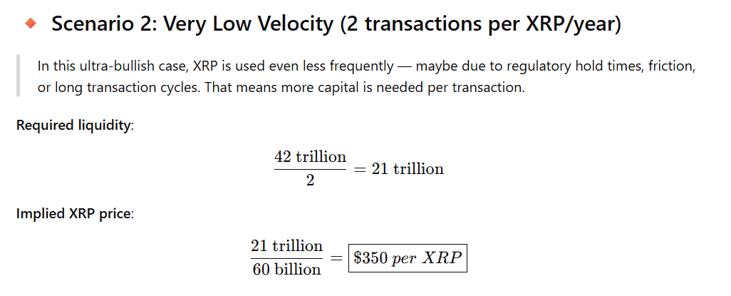 At this rate, the system would need $21 trillion in XRP liquidity. With the same 60 billion token supply, the price estimate jumps to around $350 per XRP.
