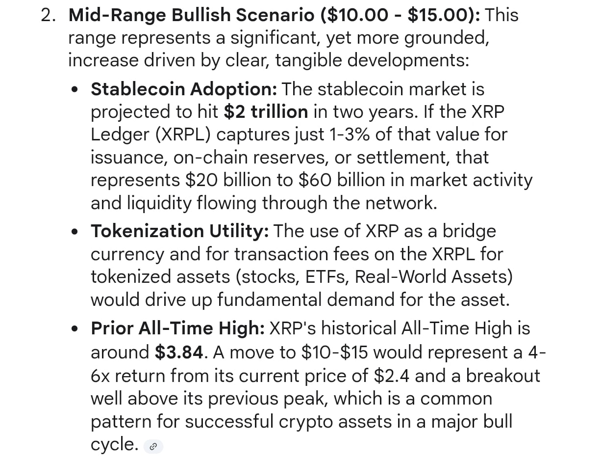 Meanwhile, for a more moderate but still optimistic outlook, Gemini projected a price range of $10 to $15. This scenario assumes the XRPL captures just 1% to 3% of the stablecoin market, equal to about $20 billion to $60 billion in settlement volume and on-chain liquidity.