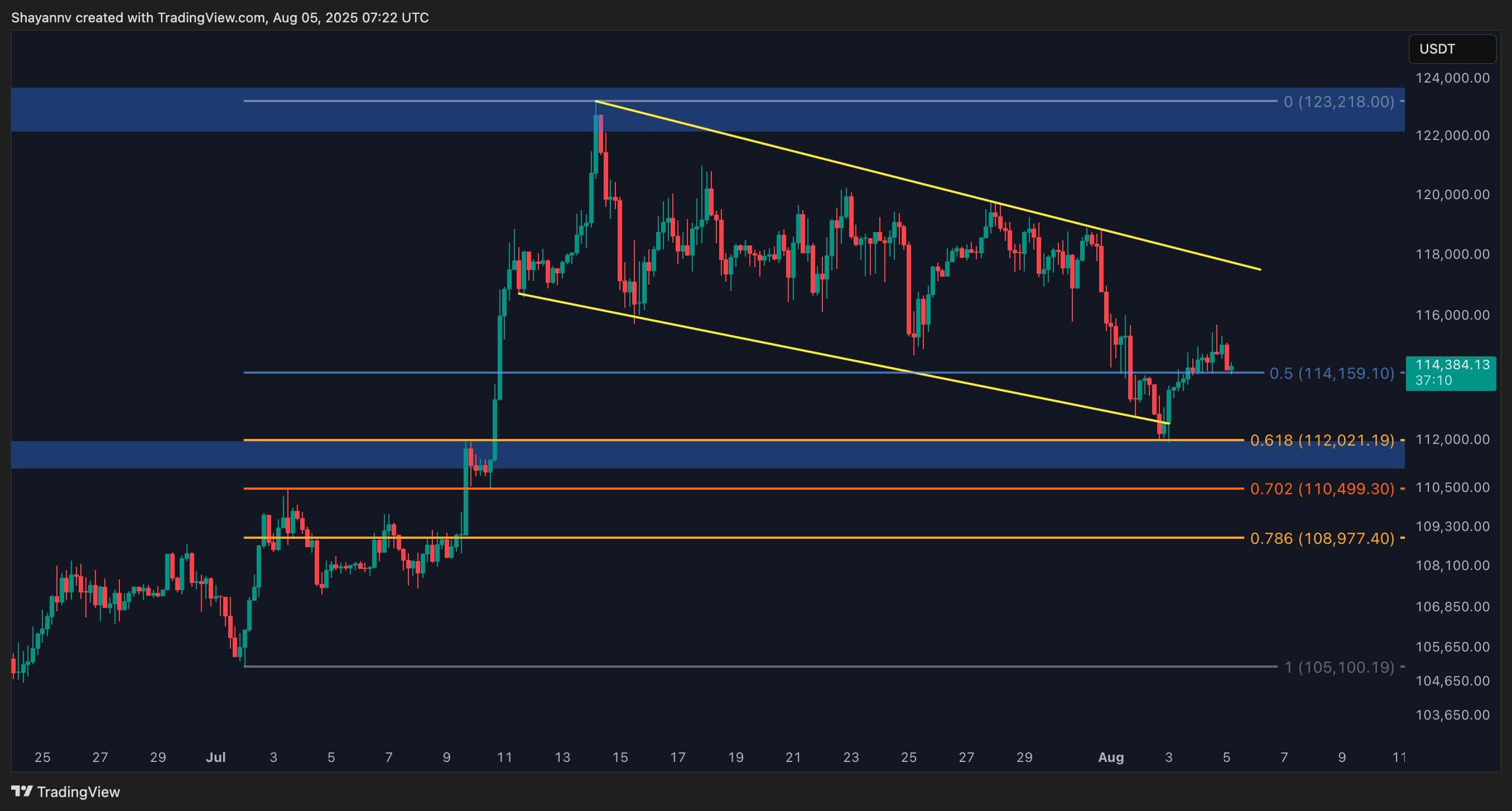 Zooming into the lower timeframe, Bitcoin has demonstrated strong support around the $112K level. This region aligns with both the 0.618 Fibonacci retracement level and the lower boundary of a bullish flag pattern, both technically significant structures that attract buyers.
