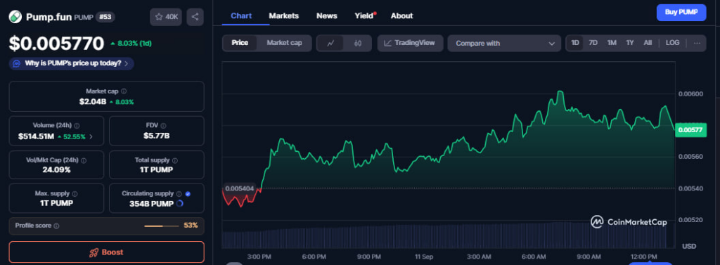 - PUMP trades at $0.005770 after gaining more than 8% in the previous day.