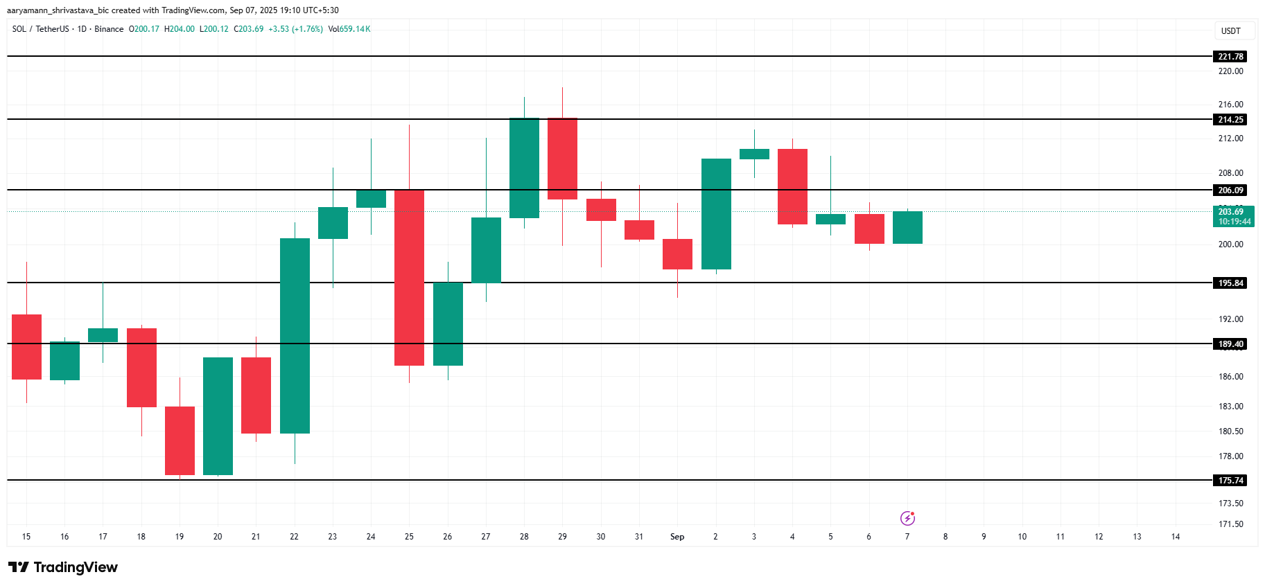 Strong investor support could push SOL past $206 and toward $214 in the coming days. A successful breakout above that level would open the door to $221, adding momentum to the bullish outlook.