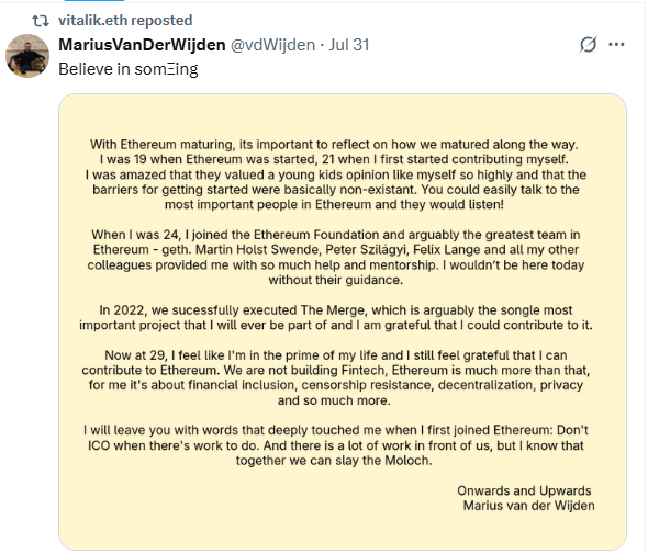 The sudden pump is in part linked to an X repost by Buterin of a July 31 post from Marius van der Wijden, a prominent figure in the Ethereum ecosystem. In the post titled “Believe in somΞing,” he shared an introspective message about his journey with the network as it marked its 10th anniversary.