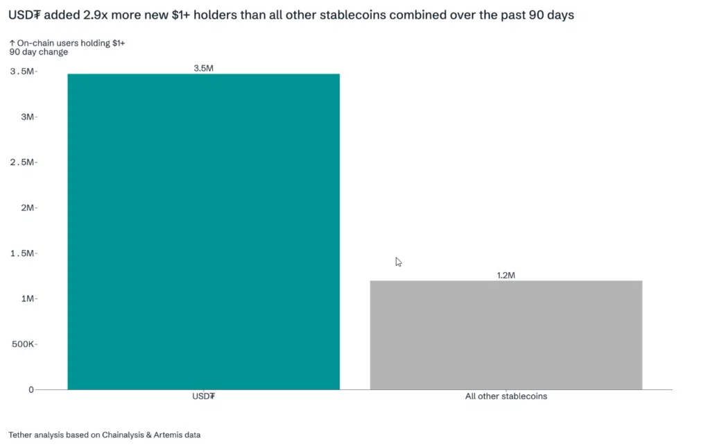 For Tether, the company issuing USDT, the Bolivian case validates its strategy in emerging markets. Global data from the company indicates that its stablecoin has added 2.9 times more holders with balances over $1 in the last three months, compared to all other stablecoins combined.