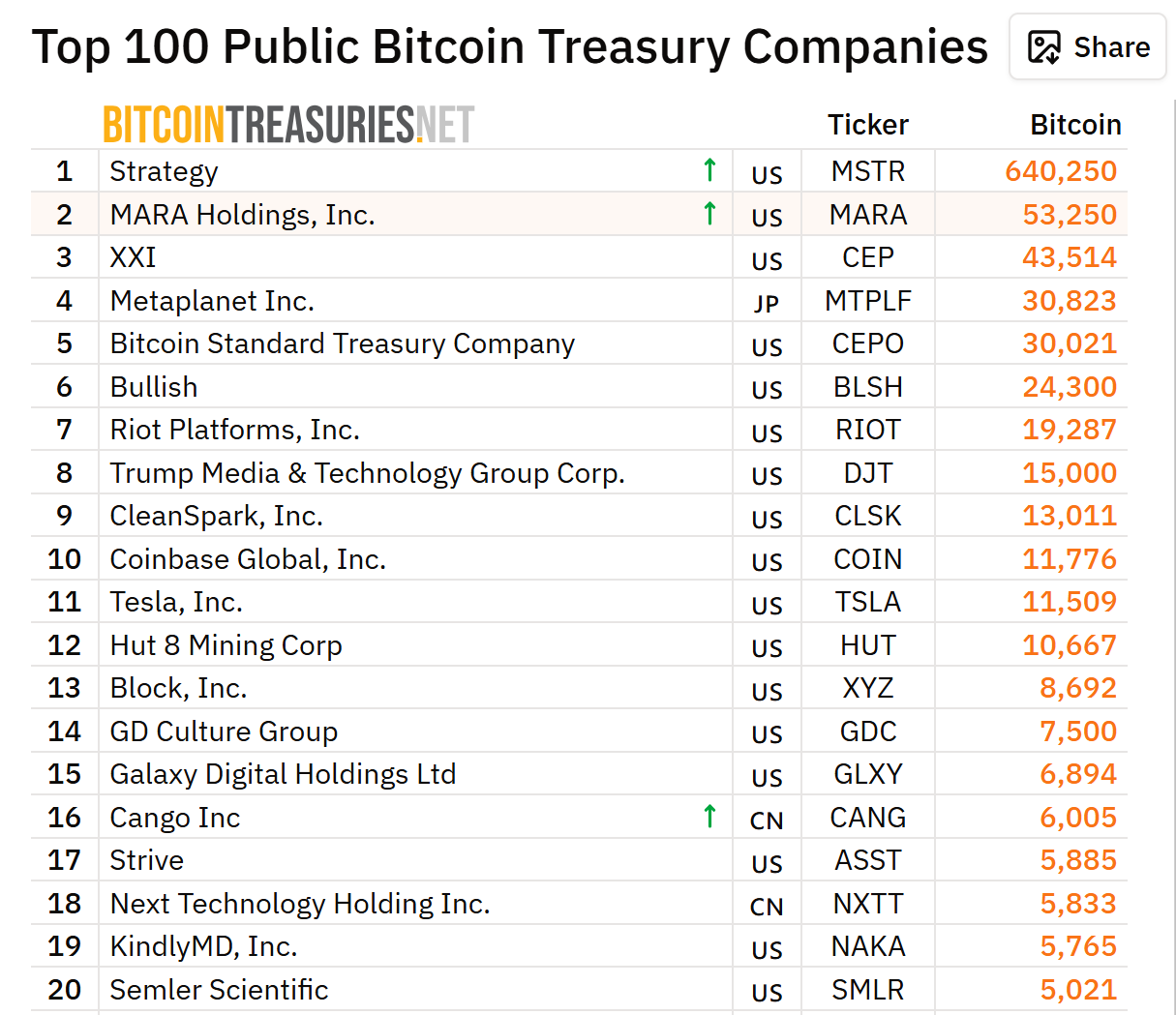 The top Bitcoin treasury holders are led by Strategy (MicroStrategy) with a massive 640,250 BTC, followed by MARA Holdings with 53,250 BTC and Cantor Fitzgerald-backed Twenty One Capital (XXI) with 43,514 BTC.