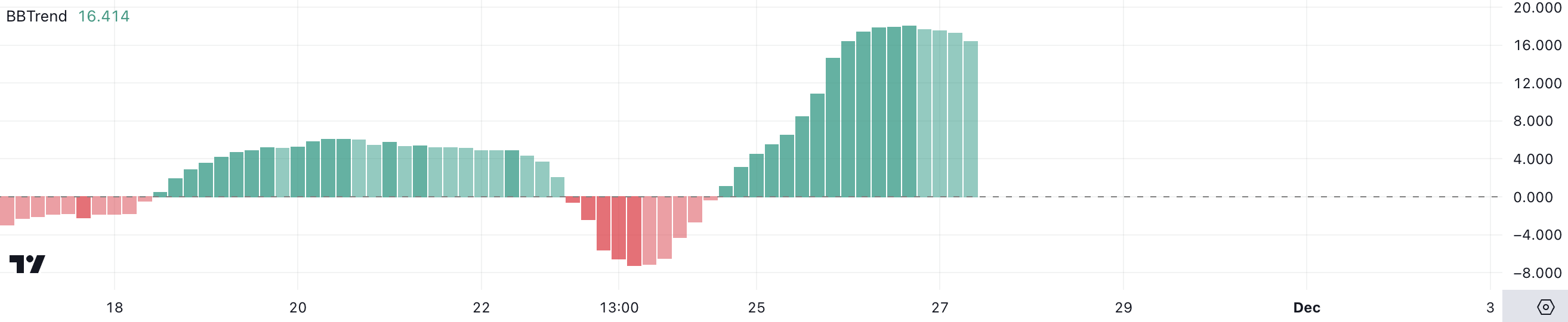 UNI BBTrend is currently at 16.5, remaining positive since November 24 after briefly turning negative between November 23 and November 24. The BBTrend, or Bollinger Bands Trend, measures the strength and direction of price movements relative to the Bollinger Bands.