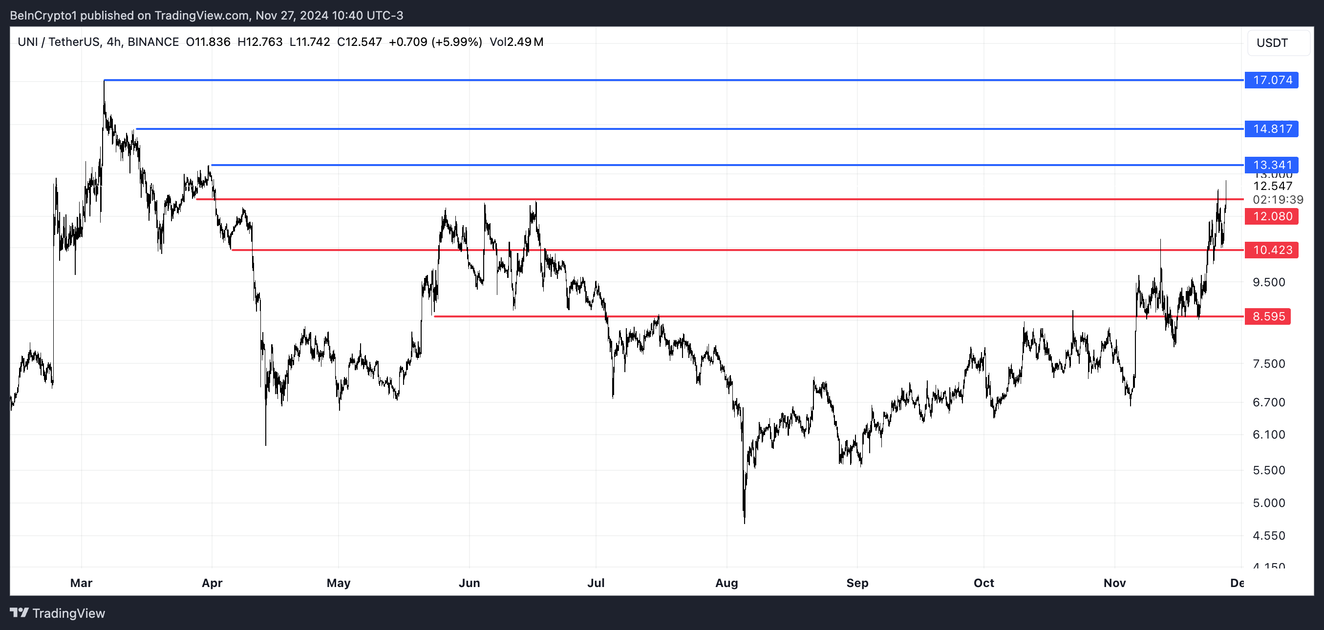 If the uptrend continues, UNI could test resistance at $13.3 and $14.8, with a potential push to $17, but a reversal could see it retest supports at $12 or drop to $8.59.