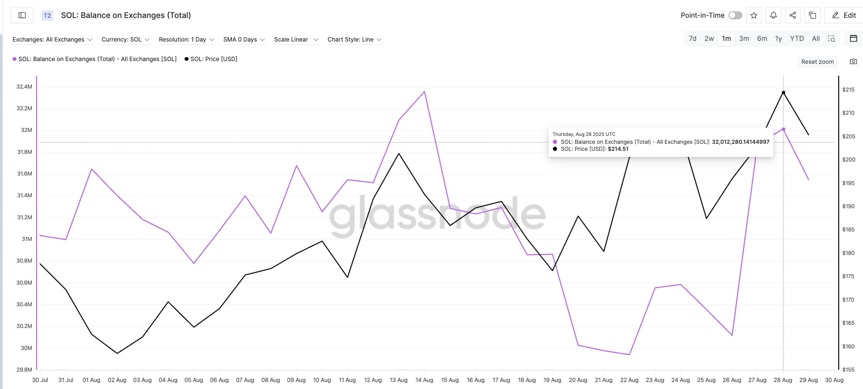 The correlation is clear. On August 14, when balances peaked above 32 million, the Solana price dropped 8% from $192 to $176 within days.