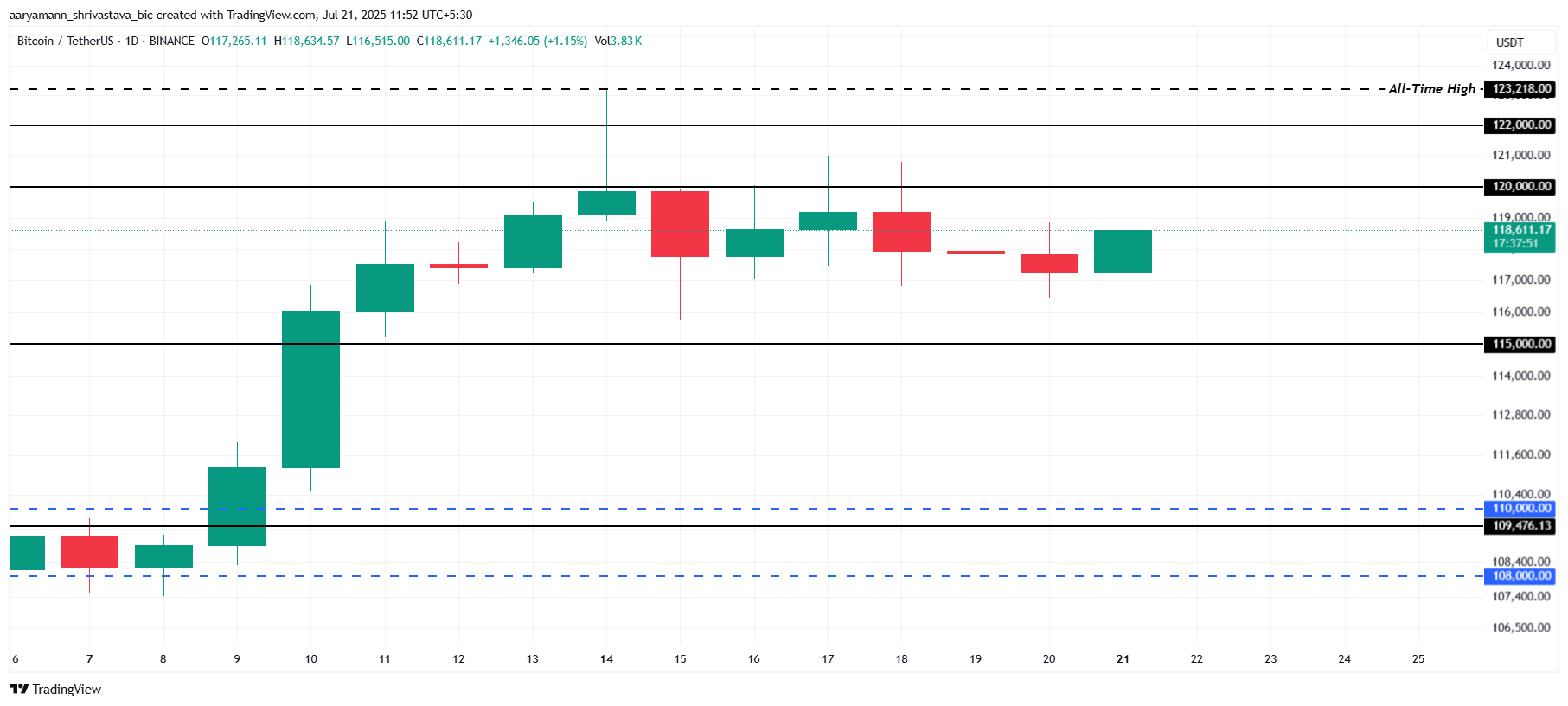 Bitcoin price is hovering at $118,611, indicating a pause in its recent bullish momentum. As altcoins take the lead in market rallies, BTC appears to be consolidating. This shift suggests that traders are rotating capital into altcoins, hinting at the start of a potential altcoin season across the crypto space.