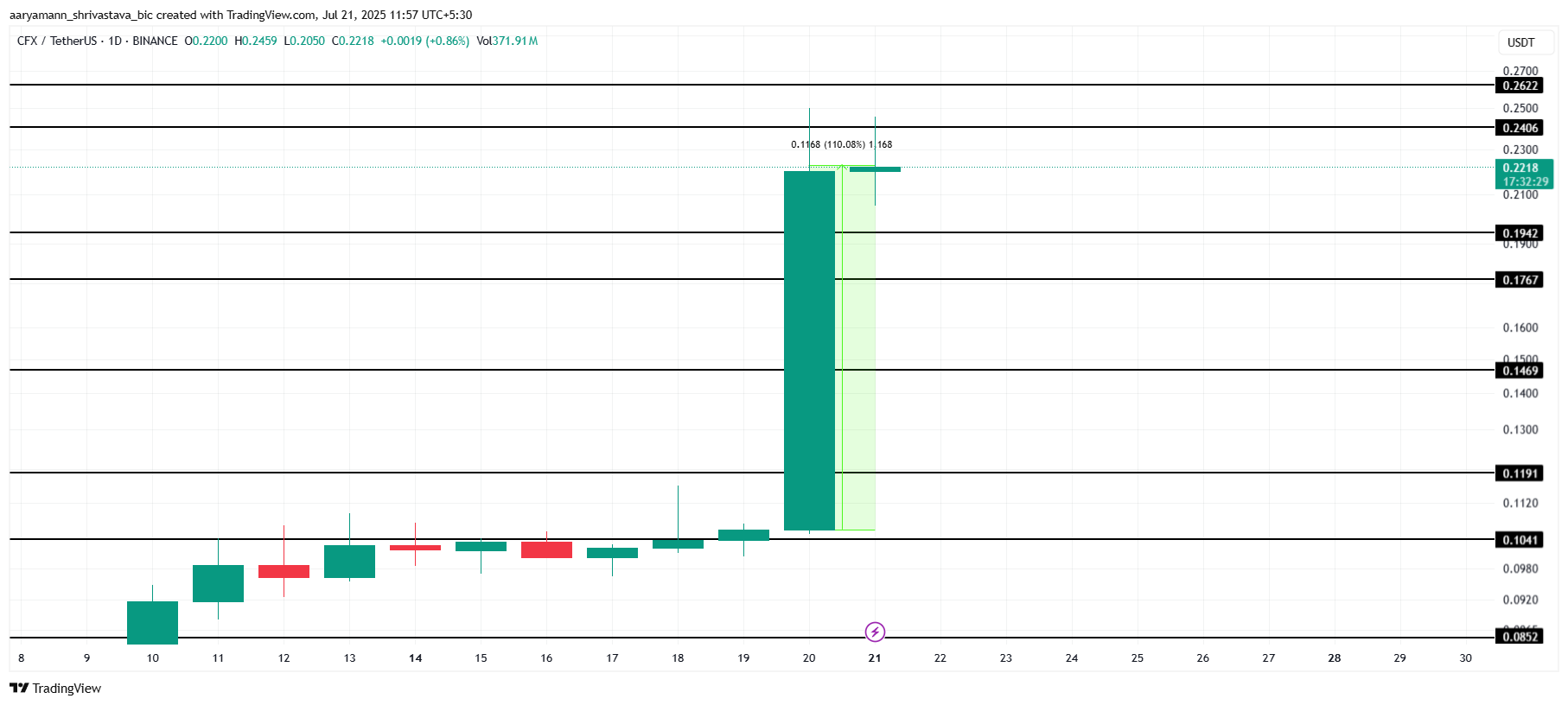 CFX price surged 110% in the past 24 hours, making it the best-performing altcoin of the day. The rally followed the successful conclusion of the Conflux conference in Shanghai. The event spotlighted recent ecosystem developments, fueling investor optimism.