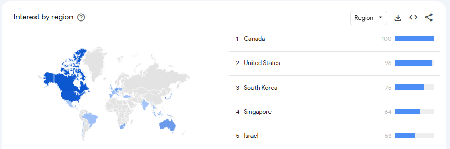 Canada leads the search activity, followed by the United States, South Korea, Singapore, and Israel.