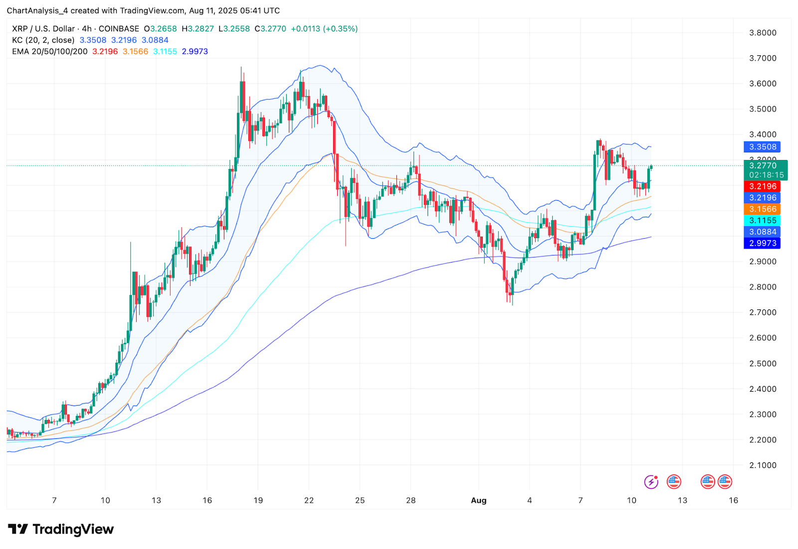 There is clear confluence across timeframes. On the 4 hour chart, XRP trades above every key EMA. The EMA20 is $3.2196, the EMA50 is $3.1566, the EMA100 is $3.1155, and the EMA200 is $2.9973. The Keltner Channel upper band at $3.3508 is the first resistance overhead.