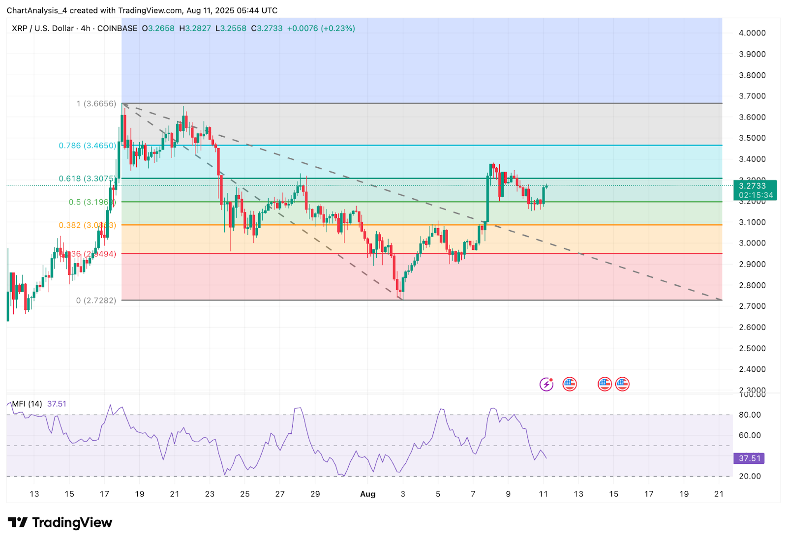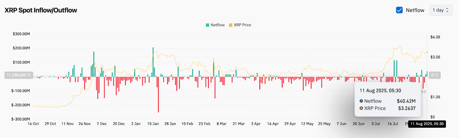Spot netflows on August 11 came in at +$40.42M, which signals fresh capital during this rebound. Liquidity sits above at $3.4650 and at the prior high near $3.6656. On the downside, liquidity pools are near $3.0933 and deeper at $2.72, which aligns with the 0 percent Fibonacci mark.