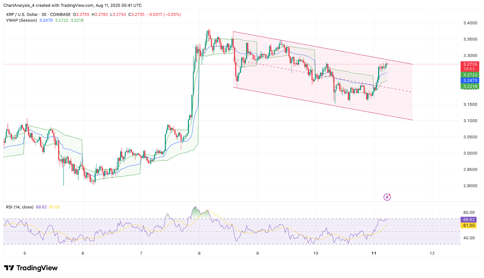Short term momentum is improving. The 30 minute RSI reads 68.62, while price is hovering near VWAP at $3.2722.