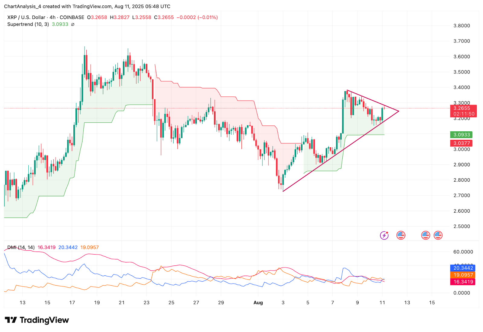 The XRP price today is $3.277 after a steady rebound from last week’s pullback off the $3.6656 peak. On the daily Smart Money Concepts view, $3.6656 is marked as a weak high with liquidity parked above it. Price found a firm bid at $3.0933, the point where the 4 hour Supertrend flipped bullish, and it continues to trade above the $3.09 demand zone that formed during July’s breakout.
