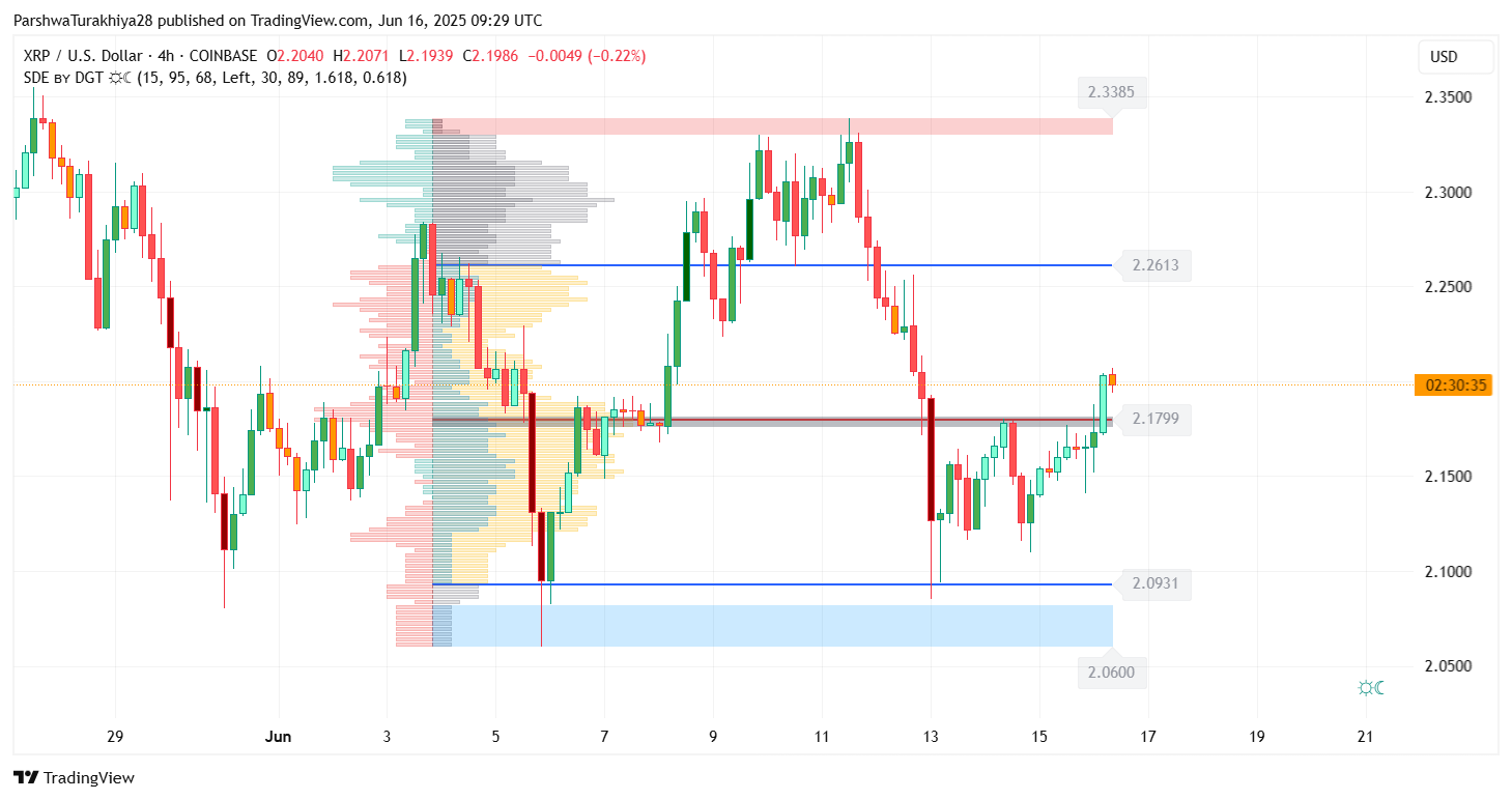 From a Smart Money Concepts perspective, the $2.06–$2.09 demand zone acted as a liquidity sweep, with multiple stop-hunts triggering a bounce. The subsequent rally has pierced minor supply zones, with eyes now on the $2.26–$2.34 resistance block. This area previously acted as a supply trap in early June and is loaded with volume profile resistance.