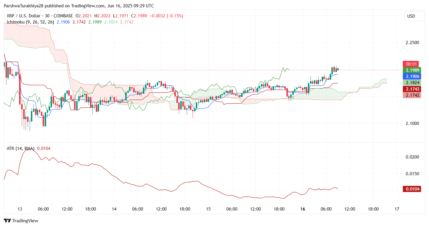 Simultaneously, the 14-period ATR (Average True Range) on the 30-minute Ichimoku chart has slightly increased from extremely compressed levels (0.0104), indicating rising XRP price volatility as the market exits consolidation.