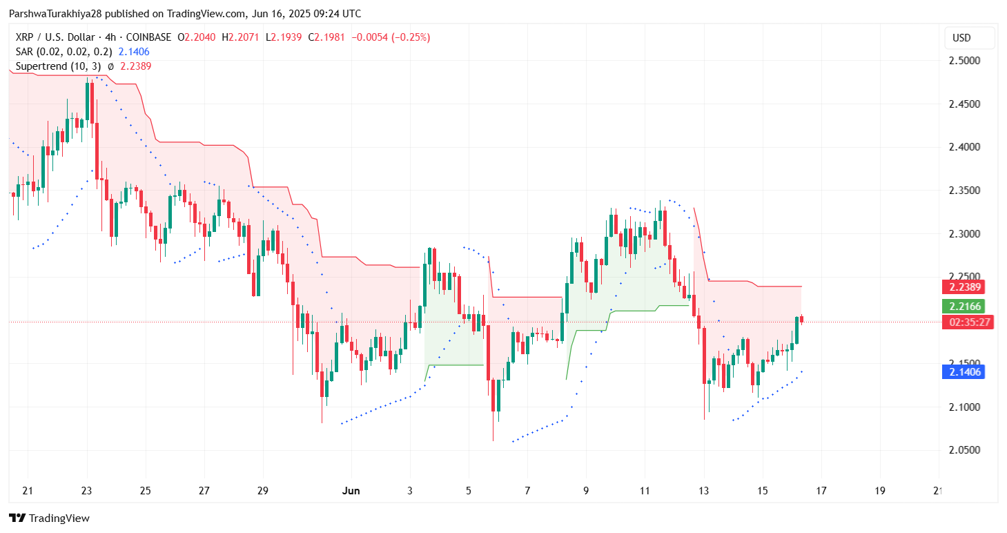 One of the clearest bullish signals is the Supertrend indicator, which flipped green on the 4-hour chart near $2.15, providing a trailing support at $2.14. This flip came after XRP reclaimed its short-term moving averages, adding conviction to the recovery. The Parabolic SAR dots have also flipped below the price, reinforcing bullish control.