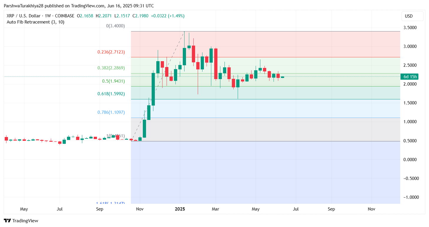 The bullish Fib levels from the weekly chart show that XRP has reclaimed the 0.5 retracement at $1.94 and is pushing toward the 0.382 Fib at $2.28. A successful close above that would set sights on the 0.236 level near $2.71 which is a medium-term target if trend conditions persist.